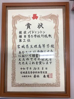今回、この大会で学校対抗戦準優勝という結果を残すことができました。これは、部長をはじめとした部員9名全員で勝ち取れたものだと思っています。これからも、この結果に甘えることなく、来年春の総体シーズンに向けて、日々努力を重ねていきたいと思います。応援よろしくお願いします。また、亘理高校入学を考えている中学生の皆さん、入学したらぜひ一緒に部活動に励みましょう。